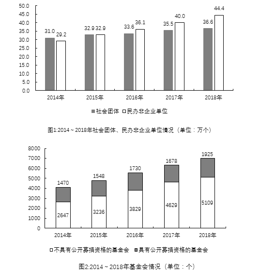 截至2018年底,全國共有社會(huì)組織81.7萬個(gè),比上年增長7.3%,其中社會(huì)團(tuán)體36.6萬個(gè),民辦非企業(yè)單位44.4萬個(gè),基金會(huì)7034個(gè);吸納社會(huì)各類人員就業(yè)980.4萬人,比上年增長13.4%。