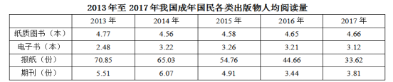 2017年我國成年國民圖書閱讀率為59.1%,比上年增加0.3個百分點;報紙閱讀率為37.6%,比上年降低2.1個百分點;期刊閱讀率為25.3%,比上年增加1個百分點。