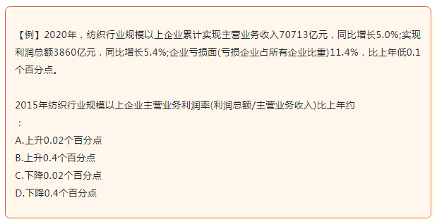 面對這個題,我們讀題的時候能讀到“2015年……比上年”,這就是兩期時間。而比較的內(nèi)容是利潤率上升還是下降了,雖然題干中提到比重相關的任何字眼,但是因為利潤率本身是一個“率”,那么這道題讓我們比較一個率的變化,使用的技巧就是兩期比重變化的技巧!下面讓我們跟著步驟解決這道題。
