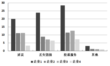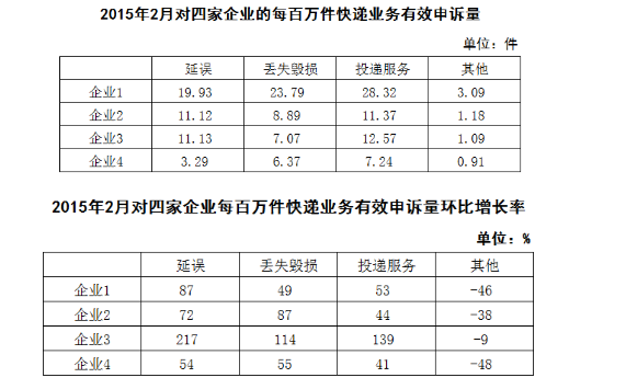 2015年2月,全國(guó)每百萬(wàn)件快遞業(yè)務(wù)中,有效申訴量未23.4件,對(duì)企業(yè)1的每百萬(wàn)件有效申訴量為75.13件,環(huán)比增長(zhǎng)48.0%,對(duì)企業(yè)2的每百萬(wàn)件有效申訴量未32.56件,環(huán)比增長(zhǎng)55.0%,對(duì)企業(yè)3的每百萬(wàn)件有效申訴量為31.86件,環(huán)比增長(zhǎng)140.0%,對(duì)企業(yè)4的每百萬(wàn)件有效申訴量為17.81件,環(huán)比增長(zhǎng)36.0%。