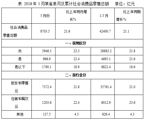 問:2018年5月份,社會消費品零售總額按地區(qū)分,總額最高的比總額最低的多多少?( )