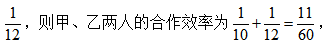 方法二:假設總工作量為60(10和12的最小公倍數(shù)),則甲的工作效率是6,乙的工作效率是5,合作5小時后還剩工作量60-(6+5)×5=5,乙還需工作1小時,所以完成這項工作共用5+1=6小時,本題選擇B項。