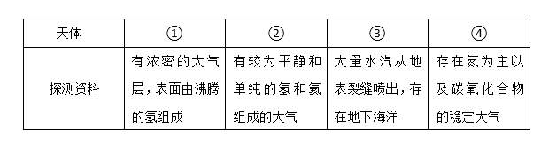 8.“旅行者1號(hào)”空間探測(cè)器經(jīng)過(guò)36年的人類星際探索,沿途探索①木星、②土星、③土衛(wèi)二、④土衛(wèi)六是否存在生命跡象,并發(fā)回資料。閱讀表格,依據(jù)探測(cè)資料判斷將來(lái)最有可能孕育生命的天體是:( )