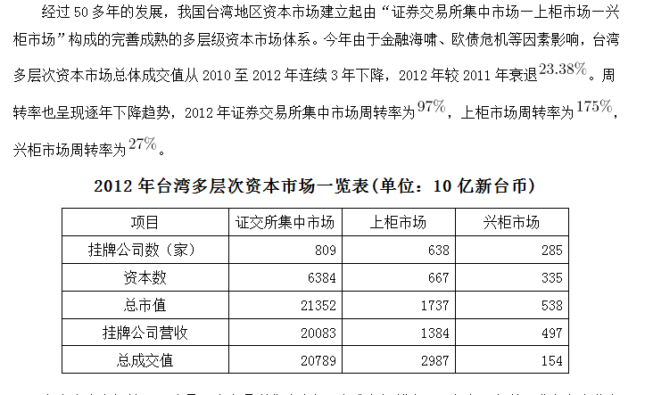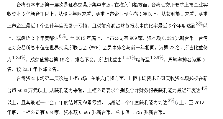 臺(tái)灣資本市場(chǎng)第三層次為興柜市場(chǎng)。在準(zhǔn)入門檻方面,興柜市場(chǎng)沒(méi)有營(yíng)業(yè)利潤(rùn)、資本額、設(shè)立年限的限制,只需符合已經(jīng)申報(bào)上市或上柜輔導(dǎo)且兩家以上證券商書面推薦。至2012年底,興柜公司285家,資本額0.335兆新臺(tái)幣,總市值0.538兆新臺(tái)幣。