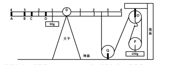 85.如圖所示,地面上有一架天平,天平左端系有一個(gè)50g的物體,右端通過繩子連接一組滑輪?;喗M合中,O、Q為定滑輪,P為動(dòng)滑輪,下端系有一個(gè)100g的物體。要使天平兩端平衡,需要的操作是( )。