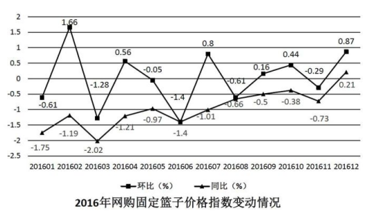 B.2016年,每個(gè)月網(wǎng)購固定籃子價(jià)格指數(shù)都低于上年同期