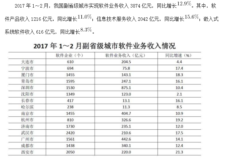 105.關(guān)于2017年1~2月副省級(jí)城市軟件業(yè)務(wù),能夠從上述資料中推出的是:( )