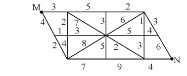 76. M、N兩地之間要架設(shè)電纜,已知兩地之間地勢(shì)復(fù)雜,電纜的架設(shè)需要繞道,繞道線路和相應(yīng)的線路會(huì)導(dǎo)致的電量損耗(即所示數(shù)字,單位略)見(jiàn)右圖。則從M到N架設(shè)電纜的電量損耗最低為: