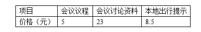 77. 某次會(huì)議需要印制會(huì)議材料,參會(huì)人員共計(jì)300人,每人發(fā)放一份會(huì)議議程,每5人共用一份會(huì)議討論資料,每間客房(每間住2人,無(wú)單人)發(fā)放一份本地出行提示。會(huì)議材料的印制價(jià)格如下,則印制會(huì)議材料一共需要花費(fèi)多少元:( )