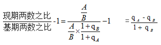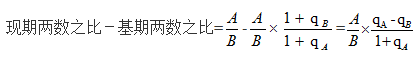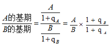 當(dāng)題目中出現(xiàn)了兩數(shù)之比各個(gè)量的現(xiàn)期值A、B和對(duì)應(yīng)的增長(zhǎng)率qA和qB,要求兩數(shù)之比的基期值,如下: