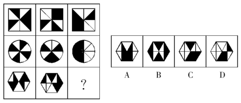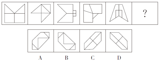 【答案】B【解析】題干圖形均為軸對稱圖形,且圖形的對稱軸依次順時針旋轉(zhuǎn)45°,因此問號處的圖形應(yīng)具有向右傾斜45°的對稱軸,排除A、C。再次觀察圖形發(fā)現(xiàn),奇數(shù)項(xiàng)圖形中對稱軸與圖形的某一線段重合,偶數(shù)項(xiàng)圖形中對稱軸不與圖形中的任一線段重合。問號處為第六個圖形,應(yīng)選擇對稱軸不與圖形中任一線段重合的圖形,排除D。故本題選B。