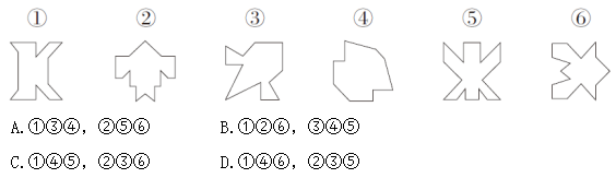 【答案】C【解析】整體來看,圖形都是對稱圖形,對稱軸都為一條,那就觀察對稱軸的位置情況,圖形①④⑤的對稱軸過圖形的線,圖形②③⑥的對稱軸過圖形的點(diǎn)。故本題選C。