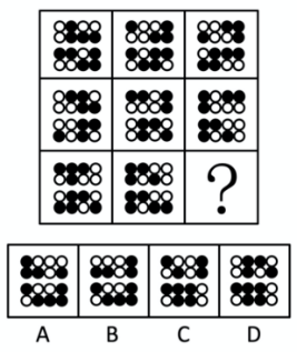 【答案】D【解析】第一步,看九宮格第一行,外部輪廓相同,內(nèi)部黑白顏色不同,且數(shù)量不一致,判定規(guī)律為黑白疊加。疊加規(guī)律為,第一個圖形與第二個圖形疊加,得到第三個圖形。同一個位置,前兩個圖形顏色相同,到第三個圖形變?yōu)楹谏?/span>;前兩個圖形顏色不同,到第三個圖形變?yōu)榘咨?。第二步,?yàn)證第三行,選擇選項(xiàng)D。