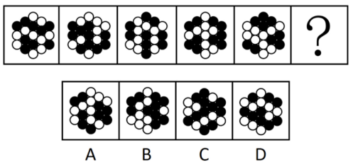 【答案】A【解析】首先分析題干特征,黑色與白色數(shù)量明顯非常多,移動與疊加無從入手,可以先從整體上去看特征。我們會發(fā)現(xiàn),題干的五個圖形,白球的排列相對來講比較規(guī)律,那我們就單獨(dú)來看白球的部分,第一個圖形白球呈現(xiàn)的是軸對稱特征,第二個是中心對稱,第三個軸對稱,第四個中心對稱,第五個軸對稱,所以問號處要選擇一個白球部分是中心對稱的圖形。選項(xiàng)中只有A選項(xiàng)符合特征。