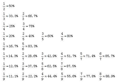 做到這里相信同學們對我們特征數(shù)字法有了一定的了解,但是可能部分同學也會冒出一個疑惑,就是自己只知道常見的百分數(shù)和分數(shù)之間的轉(zhuǎn)換,但是許多不常見的百分數(shù)還是不知道該轉(zhuǎn)換為多少,政華教育在此為考生們整理了一下常見的百分數(shù)和分數(shù)之間的轉(zhuǎn)換表格,希望對大家有所幫助。