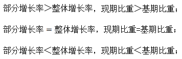 為現(xiàn)期比重,一定大于0,1+部分增長率>0。因此,作差的結(jié)果是否大于0,就取決于部分增長率-整體增長率是否大于0。