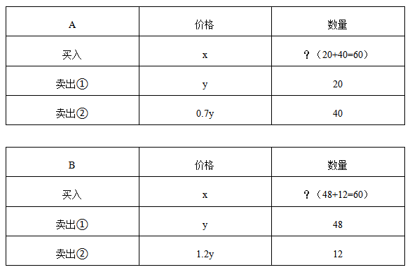 B的利潤是A的3倍,可得:48y+1.2y×12-60x=(20y+0.7y×40-60x)×3;化簡整理得120x=81.6y,則所求x/y=0.68。答案選B。