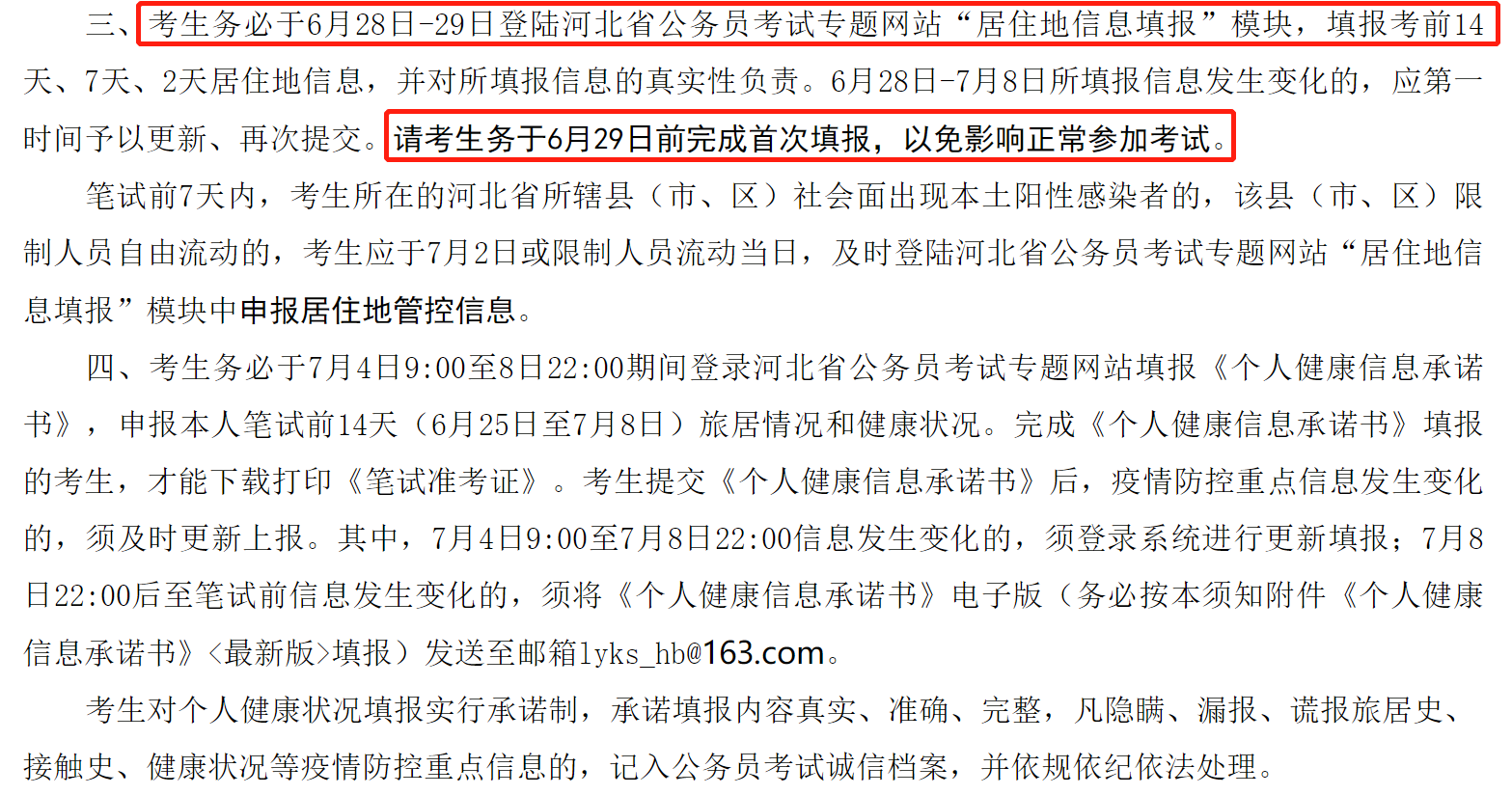提醒:考生務必于6月28日-29日登陸河北省公務員考試專題網(wǎng)站“居住地信息填報”模塊,填報考前14天、7天、2天居住地信息,并對所填報信息的真實性負責。6月28日-7月8日所填報信息發(fā)生變化的,應第一時間予以更新、再次提交。請考生務于6月29日前完成首次填報,以免影響正常參加考試。