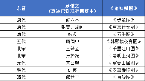 ②顧愷之:東晉,與曹不興、陸探微、張僧繇合稱“六朝四大家”,為傳統(tǒng)繪畫的發(fā)展奠定了基礎(chǔ)?!杜敷饒D》。