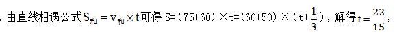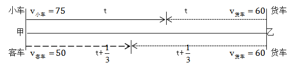 例題:小車、客車從甲地開往乙地,貨車從乙地開往甲地,它們同時(shí)出發(fā),貨車與小車相遇20分鐘后又遇客車。已知小車、貨車和客車的速度分別為75千米/時(shí)、60千米/時(shí)和50千米/時(shí),則甲、乙兩地的距離是:( )
