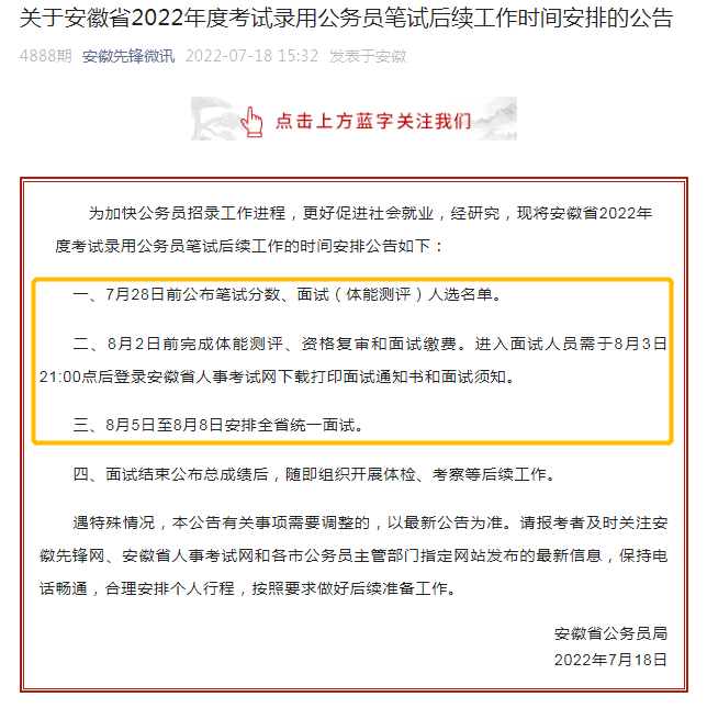 重磅消息!2022年安徽公務(wù)員7月28日前公布筆試分?jǐn)?shù),8月5日至8月8日安排全省統(tǒng)一面試!