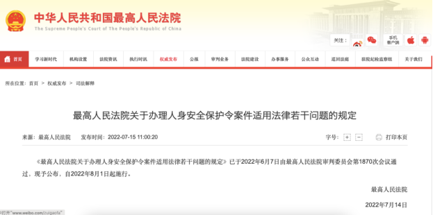 7月15日,最高人民法院發(fā)布《關于辦理人身安全保護令案件適用法律若干問題的規(guī)定》