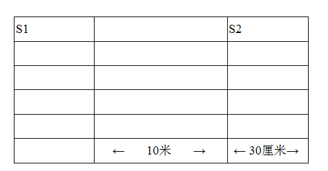 測(cè)試方法為:受測(cè)者用站立式起跑,聽到發(fā)令后從S1線外起跑,當(dāng)跑到S2線前面,用一只手拿起一木塊隨即往回跑,跑到S1線前時(shí)交換木塊,再跑回S2交換另一木塊,最后持木塊沖出S1線,記錄跑完全程的時(shí)間。記錄以秒為單位,取一位小數(shù),第二位小數(shù)非“0”時(shí)則進(jìn)1。測(cè)評(píng)次數(shù)不超過2次,考生有1次測(cè)評(píng)達(dá)標(biāo)的視為該項(xiàng)目合格。