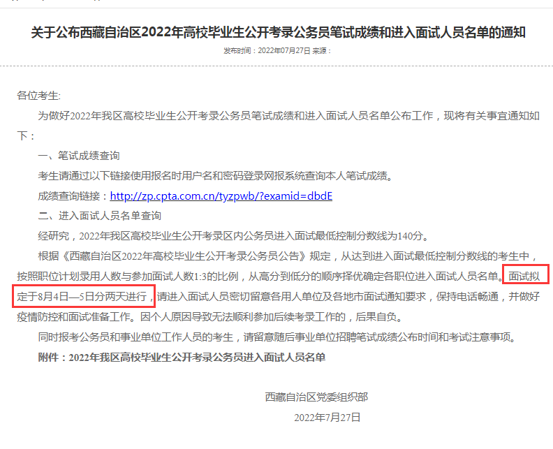 2022年西藏公務(wù)員考試筆試成績已經(jīng)公布,面試名單已經(jīng)公布,面試擬定于8月4日—5日分兩天進(jìn)行。
