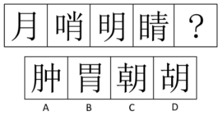 【答案】B【解析】觀察圖形,圖形相異,存在相同組成部分“月”字,但無(wú)法選出答案,可考慮數(shù)量關(guān)系,由于全是漢字,且封閉區(qū)域較多,可優(yōu)先數(shù)封閉區(qū)域數(shù)。題干各圖形封閉區(qū)域數(shù)(獨(dú)立的白色整體)為2、3、4、5。“?”處應(yīng)填入為6的選項(xiàng)。選項(xiàng)中只有B滿足,故正確答案為B。
