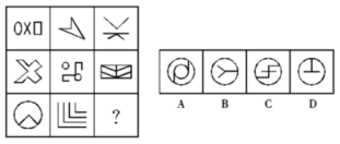 【答案】B【解析】觀察圖形會(huì)發(fā)現(xiàn),九宮格整體圖形比較凌亂,無(wú)從下手,需要考慮圖形存在的共性,優(yōu)先考慮圖形自身特性。觀察后會(huì)發(fā)現(xiàn)第一行都是軸對(duì)稱圖形,且每個(gè)對(duì)稱軸按順時(shí)針45度旋轉(zhuǎn)。第二行也是均為軸對(duì)稱圖形,且對(duì)稱軸按順時(shí)針45度旋轉(zhuǎn)。所以,第三行應(yīng)為軸對(duì)稱圖形,對(duì)稱軸方向按順時(shí)針45度旋轉(zhuǎn),故所填“?”處應(yīng)是水平軸對(duì)稱的圖形。本題答案選B。