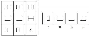 【答案】D【解析】觀察圖形會(huì)發(fā)現(xiàn),圖形部分相似,但整體元素的個(gè)數(shù)有增減,所以重點(diǎn)從疊加考慮。觀察之后會(huì)發(fā)現(xiàn),每列后兩個(gè)圖形疊加,保留所有線條,得到第一個(gè)圖形。所以第三列需要“?”處的圖形與第二個(gè)圖疊加,保留所有線條,得第一個(gè)。故本題答案選D。